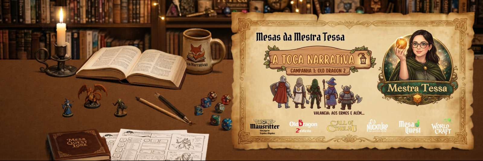 Bem vindo, Sou narradora e exploradora de mundos fantásticos há mais de 2 anos conduzindo aventuras que nasceram das mesas em família. Apaixonada por fantasia, OSR e jogos Old School sempre testando novas aventuras. Minha proposta é simples: mesas acolhedoras, criativas e cheias de história, onde qualquer idade pode sentar, sem medo de errar, aprendendo juntos a jogar e viver uma boa aventura. E aprendendo muito aqui, utilizando o WorldCraft para novas aventuras, te convido a vir com minha mesa!